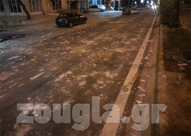 Οι περισσότερες ζημιές καταγράφηκαν σε καταστήματα αγοράς Χρυσού, τράπεζες, ΚΕΠ, ενώ φθορές σημειώθηκαν σε σταθμευμένα Ι.Χ.. κυρίως επί της Γρηγορίου Λαμπράκη, Π. Τσαλδάρη, Λεωφόρου Σαλαμίνος.