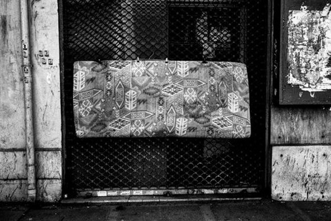(Το στρώμα ενός αστέγου «κοσμεί» την είσοδο ενός καταστήματος. Το κατάστημα έκλεισε εν καιρώ κρίσης)