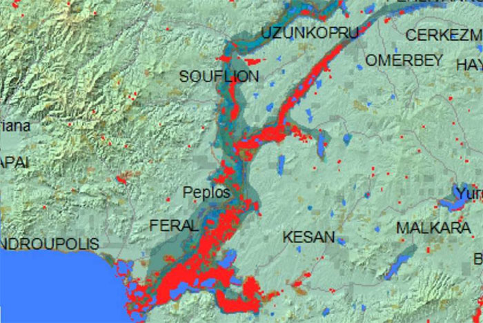 Απ’ ότι φαίνετε μέχρι τώρα από την δορυφορική αποτύπωση, η δυτική περιοχή της παρέβριας ζώνης δεν αντιμετωπίζει ιδιαίτερο πρόβλημα, με τα νερά να εκτονώνονται μερικώς από την πλευρά της Τουρκίας(φωτο)