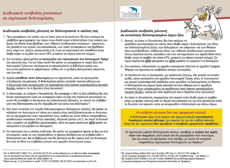 – Να ενημερωθούν σχετικά με τη δυνατότητα υποβολής μήνυσης σε περίπτωση δηλητηρίασης, ακολουθώντας τα βήματα που περιγράφονται στο έντυπο «Οδηγός Πρώτων Βοηθειών σε σκυλιά που έχουν υποστεί δηλητηρίαση στην ύπαιθρο» της Ελληνικής ΟΡΝΙΘΟΛΟΓΙΚΗΣ Εταιρείας