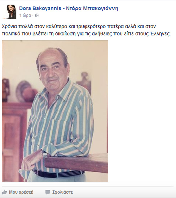 Στον επίτιμο πρόεδρο της ΝΔ ευχήθηκε η κόρη του Ντόρα Μπακογιάννη μέσω διαδικτύου. Σε ανάρτησή της στο Facebook. η οποία συνοδεύεται από σχετική φωτογραφία, η κα Μπακογιάννη αναφέρει: «Χρόνια πολλά στον καλύτερο και τρυφερότερο πατέρα, αλλά και στον πολιτικό που βλέπει τη δικαίωση για τις αλήθειες που είπε στους Έλληνες».