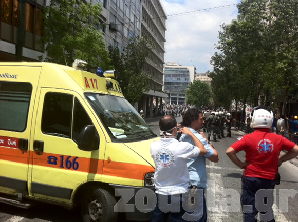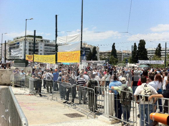 Από τις 13:00 το μεσημέρι οι απεργοί της Γ.Σ.Ε.Ε. και της Α.Δ.Ε.Δ.Υ. βρίσκονται συγκεντρωμένοι έξω από το Κοινοβούλιο, διαμαρτυρόμενοι για την ψήφιση του Μεσοπρόθεσμου Προγράμματος.