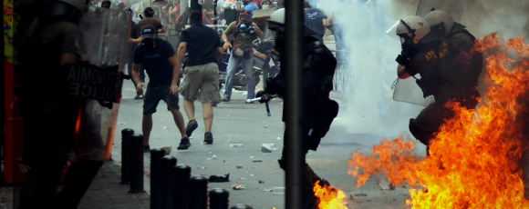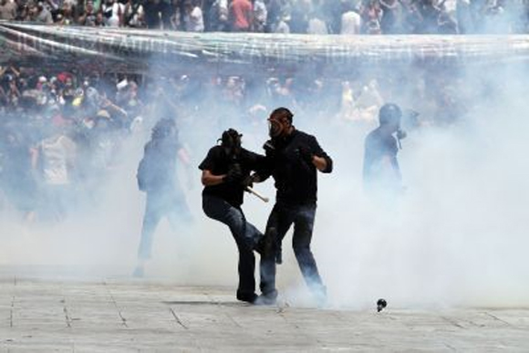 Πετροπόλεμος και εκτεταμένα επεισόδια ξέσπασαν λίγο μετά τις 13:30 στην κάτω πλευρά της πλατείας Συντάγματος, μεταξύ διαδηλωτών και δυνάμεων της αστυνομίας. Ομάδες ατόμων πέταξαν βόμβες μολότοφ εναντίον των διμοιριών των ΜΑΤ, με τους τελευταίους να απαντούν με ρίψεις χημικών και βομβίδων κρότου λάμψης.