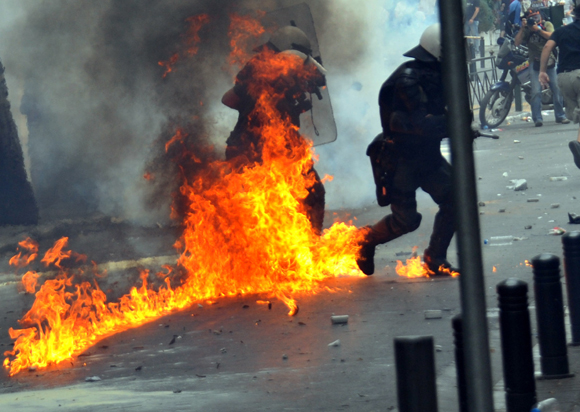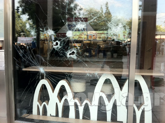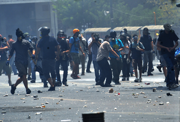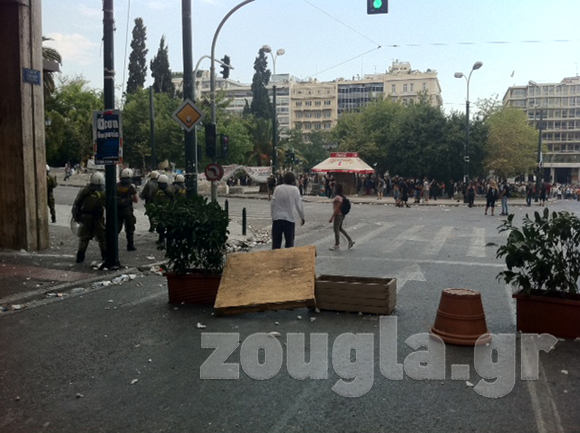 Ομάδες νεαρών, έχοντας καλυμμένα τα πρόσωπά τους, επιτέθηκαν λίγο μετά τις 15:30 εναντίον των αστυνομικών στη συμβολή της Λεωφόρου Αμαλίας με την οδό Όθωνος, εκτοξεύοντας εναντίον τους πέτρες, καδρόνια και ξύλα.