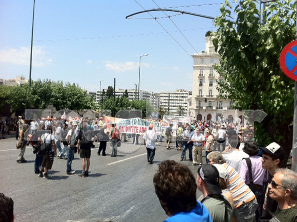Η πορεία του ΠΑΜΕ που ξεκίνησε από τις 10:00 το πρωί στην Ομόνοια και λίγα λεπτά πριν από τις 10:30 τα μέλη του έφθασαν μπροστά στο κτήριο του Κοινοβουλίου, όπου φώναζαν συνθήματα κατά της πλουτοκρατίας και του Μεσοπρόθεσμου Προγράμματος. Η πορεία του ΠΑΜΕ που πέρασε ανάμεσα από τους «Αγανακτισμένους» ολοκληρώθηκε στις 12:00 το μεσημέρι.