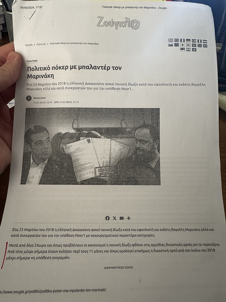 Σύμφωνα με τον κ. Διαλυνά, «από τον πρώτο βαθμό, ο Μάκης είχε μία ποινή τριών ετών καταδικαστική, διότι είχε δημοσιεύσει ένα άρθρο στο οποίο αναφερόταν ότι “παίζεται ένα πολιτικό μπαλαντέρ με την υπόθεση του Noor 1”, δηλαδή ότι κρατούν σε ομηρία τον κ. Μαρινάκη, από την πλευρά της τότε κυβέρνησης και ότι η δικαιοσύνη προχωράει με πολύ αργά βήματα, κι αυτό δημιουργεί δεύτερες σκέψεις και στον κόσμο, αλλά και γενικότερα σε όσους ασχολούνται δημοσιογραφικά, και όχι μόνο με την υπόθεση αυτή».