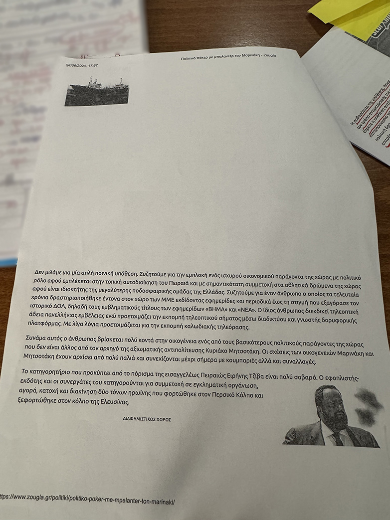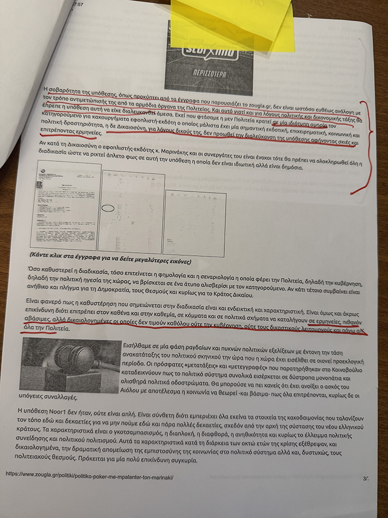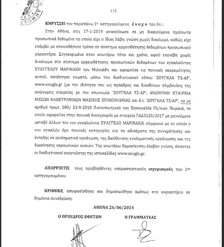 Συγκεκριμένα, στον ανωτέρω τόπο και χρόνο, αφού επενέβη χωρίς δικαίωμα στο σύστημα αρχειοθέτησης προσωπικών δεδομένων του εγκαλούντος ΕΥΑΓΓΕΛΟΥ ΜΑΡΙΝΑΚΗ του Μιλτιάδη και αφορούσε τις ποινικές εκκρεμότητες αυτού, κατέστησε γνωστό, μέσω του διαδικτυακού τόπου ‘ΖΟΥΓΚΛΑ ΤΖ-ΑΡ’, www.zougła.gr (με την ιδιότητά του ως πρόεδρος και διευθύνων σύμβουλος της ανώνυμης εταιρείας με την επωνυμία ‘ΖΟΥΓΚΛΑ ΤΖ-ΑΡ’, ΑΝΩΝΥΜΗ ΕΤΑΙΡΕΙΑ ΜΕΣΩΝ ΗΛΕΚΤΡΟΝΙΚΩΝ ΜΑΖΙΚΗΣ ΕΠΙΚΟΙΝΩΝΙΑΣ και δ.τ. ‘ΖΟΥΓΚΛΑ ΤΖ-ΑΡ’, το με αριθμό πρωτ. 580/ 13-9-2018 Πιστοποιητικό του Εισαγγελέα Πλ/κών Πειραιά, το οποίο αφορούσε στην ποινική δικογραφία με στοιχεία ΓΑΔ3120/2017 με μηνυόμενο μεταξύ άλλων τον νυν εγκαλούντα ΕΥΑΓΓΕΛΟ ΜΑΡΙΝΑΚΗ, σύμφωνα με το οποίο νυν εγκαλών έχει ποινικές κατηγορίες για τα αδικήματα της συγκρότησης και ένταξης σε εγκληματική οργάνωση, της διεύθυνσης εγκληματικής οργάνωσης και της διακίνησης ναρκωτικών ουσιών.
