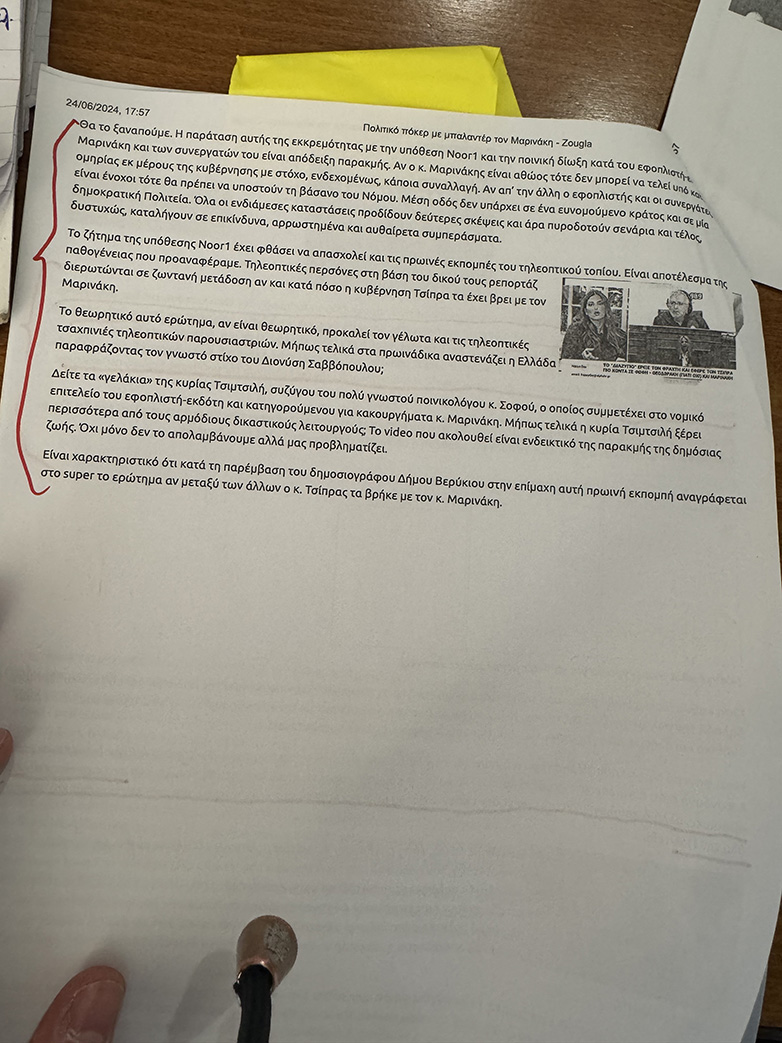Και ο κ. Διαλυνάς κατέληξε: «Αυτό το άρθρο λοιπόν, το θεώρησε ο κ. Μαρινάκης ότι αποτελεί παραβίαση προσωπικών δεδομένων, καταμήνυσε τον κ. Μάκη Τριανταφυλλόπουλο, ο οποίος σε πρώτο βαθμό, με συγκατηγορούμενή του την κα. Τζούλη Καμμένου, δικάστηκε σε ποινή φυλακίσεως τριών ετών. Η κα. Τζούλη Καμμένου αθωώθηκε και με την παρατήρηση, λέω εγώ τώρα, ότι κατά της κα. Καμμένου δεν είχε παραστεί ο κ. Μαρινάκης προς υποστήριξη της κατηγορίας, παρά μόνο, κατά του Μάκη Τριανταφυλλόπουλου. Αυτό το καταλαβαίνει ο καθένας, όπως θέλει, τι μπορεί να σημαίνει, τι δεν μπορεί να σημαίνει κτλ. Αλλά είμαι υποχρεωμένος να το πω.