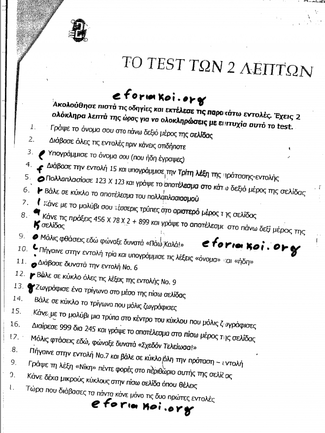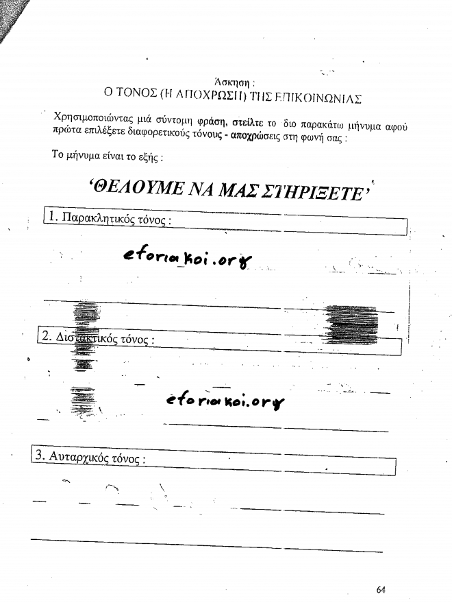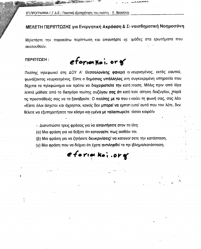 Οι οδηγίες και τα τεστ άφησαν άφωνους τους περισσότερους εφοριακούς. Όπως προκύπτει από τα… test του ΥΠΟΙΚ, τα οποία βρίσκονται στη διάθεση του zougla.gr, οι εφοριακοί μαθαίνουν μεταξύ άλλων ποιες είναι οι λέξεις και οι φράσεις που δεν πρέπει ποτέ να χρησιμοποιούν όταν μιλούν με φορολογούμενους, ενώ τους δίδονται ασκήσεις με τις οποίες καλούνται να… εξασκήσουν την ικανότητά τους στην ευεργετική ακρόαση και τη συναισθηματική νοημοσύνη.