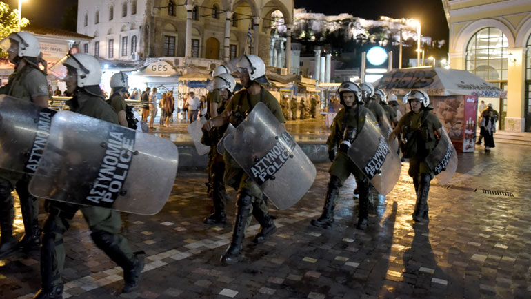 Στην οδό Ερμού και σε πολλά σημεία παραμένουν αστυνομικές δυνάμεις για τον φόβο των λεηλασιών, καθώς αρκετές βιτρίνες έχουν σπάσει.
