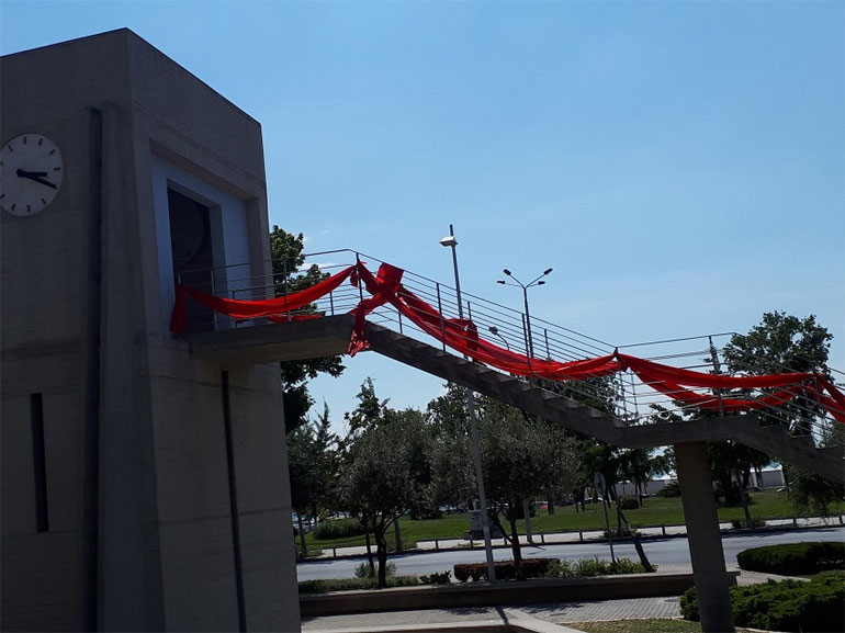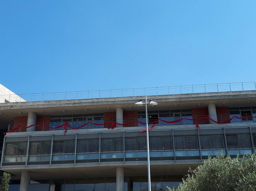Κόκκινες κορδέλες στολίζουν περιμετρικά το Δημαρχιακό Μέγαρο, στο χρώμα αυτό, που συμβολίζει το αίμα.