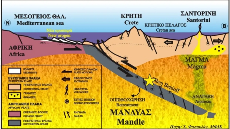 Συγκεκριμένα, αναφέρει πως «ήταν ένας παρόμοιος σεισμός με αυτόν που έγινε πριν μερικές εβδομάδες στη θάλασσα της Σητείας. Είναι ένας ενδιαμέσου βάθους σεισμός πάνω στη βυθιζόμενη, κάτω απο την Κρήτη, Αφρικανική πλάκα (κίτρινο αστέρι), γι’ αυτό και έγινε αισθητός σε μεγάλες περιοχές, από ό,τι φαίνεται ακόμα και στη βόρεια Αφρική.