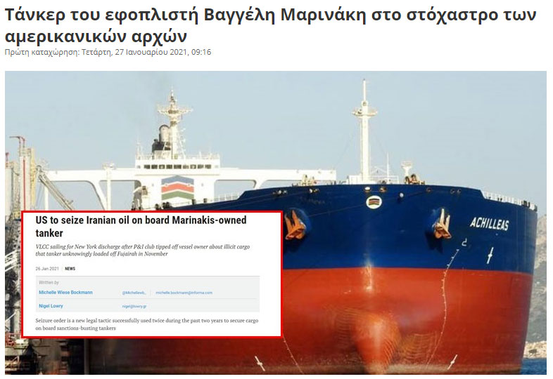 2) Όσο και αν ο αρθρογράφος της Lloydslist επιχειρεί να ερμηνεύσει τα γεγονότα, δεν εξηγείται επαρκώς η διακοπή του σήματος αυτόματου εντοπισμού του τάνκερ «Achilleas» σχεδόν αμέσως μετά την αναχώρησή του από το λιμάνι της Φουτζέιρα (31 Δεκεμβρίου) έως και τις 13 Ιανουαρίου 2021, οπότε το δεξαμενόπλοιο έπλεε ανοιχτά της Μαδαγασκάρης με ρότα στο Ακρωτήριο της Καλής Ελπίδας της Νότιας Αφρικής, με πρόθεση να εισέλθει στον νότιο Ατλαντικό ωκεανό και με τελικό προορισμό κάποιο λιμάνι του αμερικανικού βορρά. Αφού επανήλθε το σήμα αυτόματου εντοπισμού και αφού το τάνκερ «Achilleas» έπλεε πια στον νότιο Ατλαντικό, δηλώθηκε ως τελικός προορισμός του το λιμάνι της Νέας Υόρκης, όπου αναμένεται να δέσει στις 14 Φεβρουαρίου. Εκεί θα πραγματοποιηθεί και η εκφόρτωση των δύο εκατομμυρίων βαρελιών, που πλέον έχουν κατασχεθεί από τις ΗΠΑ και για τα οποία, σύμφωνα με τις διατάξεις, το αμερικανικό κράτος, προκειμένου να διασφαλίσει την αποτελεσματική λειτουργία των κυρώσεων κατά του Ιράν, έχει δεσμευτεί να καταβάλει στους πλοιοκτήτες που συνεργάζονται και μεταφέρουν παράνομα ιρανικούς υδρογονάνθρακες το αντίτιμο των εξόδων όλου του ταξιδιού του εκάστοτε δεξαμενόπλοιου.