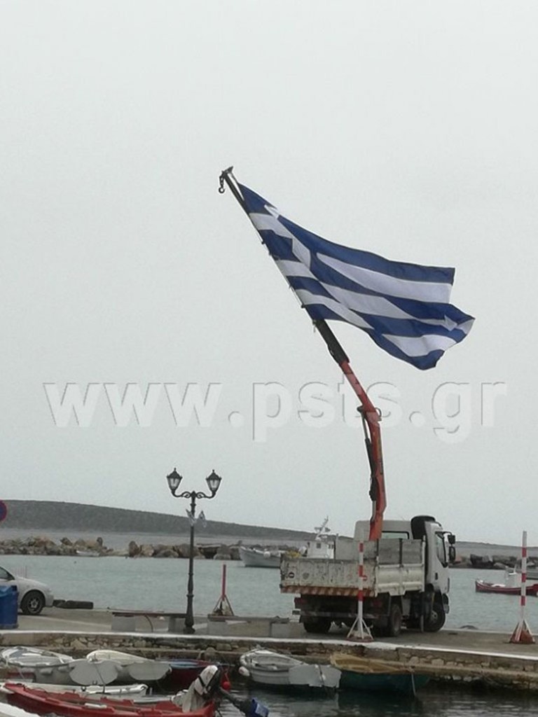 Γιγαντιαίων διαστάσεων ελληνική σημαία περίπου 6 μέτρων μήκους και 4 μέτρων πλάτους, 24 τετραγωνικών μέτρων, (προσφορά της Κατερίνας Σκιαδά), κυμάτισε με υπερηφάνια στην παραλία της κρεμασμένη ψηλά από γερανοφόρο όχημα.