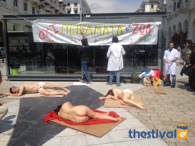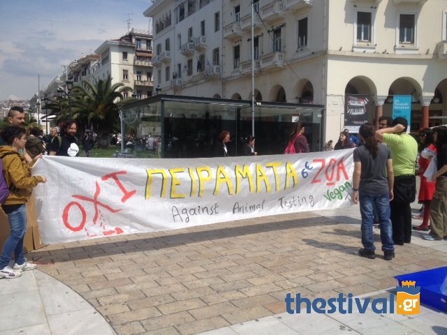 Ακτιβιστική δράση με αφορμή την Παγκόσμια Ημέρα Κατάργησης των Πειραμάτων σε Ζώα πραγματοποίησαν το μεσημέρι του Σαββάτου μέλη της συλλογικότητας Vegan Thessaloniki στην πλατεία Αριστοτέλους, προκειμένου να ευαισθητοποιήσουν τον κόσμο για την προστασία των ζώων.