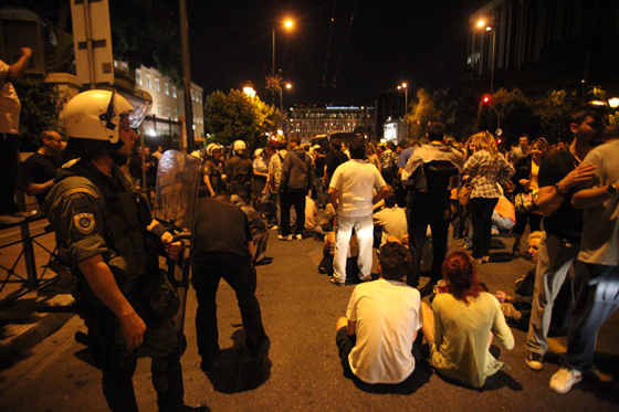 Με παράταξη ισχυρών αστυνομικών δυνάμεων κατά μήκος της λεωφόρου Βασιλίσσης Σοφίας, αλλά και μέσω του Εθνικού Κήπου, έγινε αργά τη νύχτα δυνατή η αποχώρηση βουλευτών και εργαζομένων από το κτίριο του Κοινοβουλίου, το οποίο είχε αποκλειστεί νωρίτερα, και για πολύ ώρα, από διαδηλωτές του κινήματος των «Αγανακτισμένων».