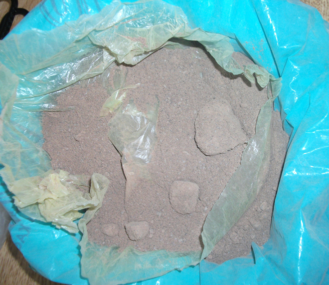 • σκόνη καφέ χρώματος άγνωστης χημικής σύνθεσης, προφανώς για τη νόθευση της ηρωίνης βάρους 850 γραμμ.,