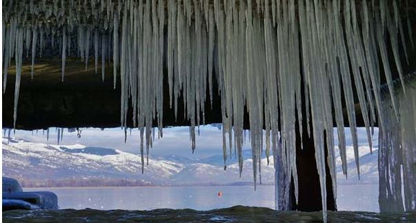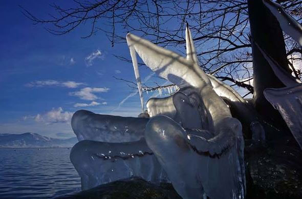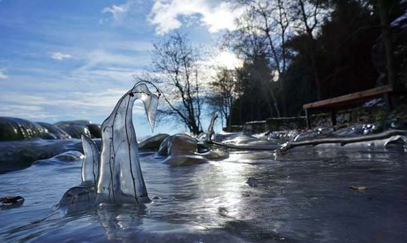 Με το θερμόμετρο να πέφτει κατά διαστήματα κάτω από τους 0 βαθμούς Κελσίου, γλυπτά από… πάγο κάνουν την εμφάνισή τους περιμετρικά της λίμνης.
