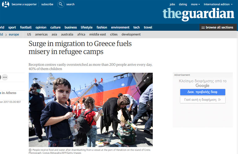 Το άρθρο της «Guardian» χαρακτηρίζει το hot spot στη Μόρια της Μυτιλήνης «το κέντρο του ανθρώπινου δράματος του 2015», με τον αριθμό των μεταναστών που φιλοξενεί να είναι υπερδιπλάσιος της χωρητικότητάς του, καθώς ανέρχονται σε 4.825.