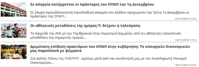 Tο διοικητικό συμβούλιο της Πανελλήνιας Ομοσπονδίας των Πρακτόρων του ΟΠΑΠ αντιδρώντας στην επιβολή φόρου στα παιχνίδια του οργανισμού αποφάσισε την κήρυξη 24ωρης προειδοποιητικής πανελλαδικής απεργίας του κλάδου την Τρίτη 1η Δεκεμβρίου 2015, με κάθοδο των μελών στην Αθήνα και πορεία διαμαρτυρίας στο Υπουργείο Οικονομικών.