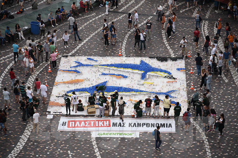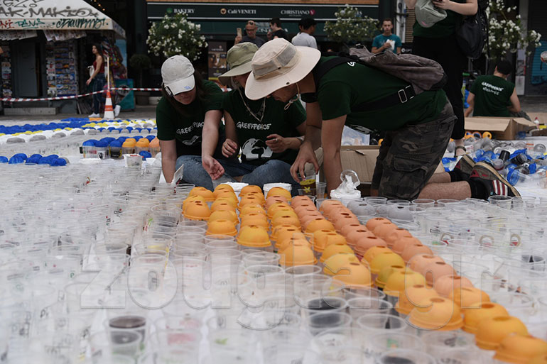 Με ένα ψηφιδωτό από 10.000 πλαστικά ποτήρια που μάζεψε από τα σκουπίδια της Αθήνας, η Greenpeace έστειλε από το Μοναστηράκι ένα δυνατό οικολογικό μήνυμα με αφορμή την Παγκόσμια Ημέρα Ωκεανών.