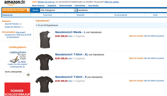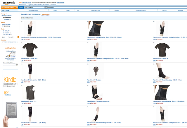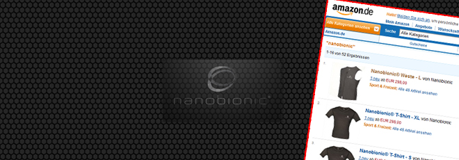 Πληκτρολογώντας www.amazon.de μπορεί κάποιος χρήστης του διαδικτύου να δει και να παραγγείλει όλα τα προϊόντα όπως το γιλέκο, το t-shirt, τη ζώνη μέσης, το κολάρο, την ειδική ελαστική επιγονατίδα, την επιαγκωνίδα της nanobionic κ.α.