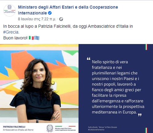 To ιταλικό Υπουργείο Εξωτερικών με ανάρτησή του στα μέσα κοινωνικής δικτύωσης εύχεται καλή τύχη στη νέα πρέσβη της Ιταλίας στην Ελλάδα με μια φωτογραφία της και μια δήλωσή της η οποία αναφέρει: