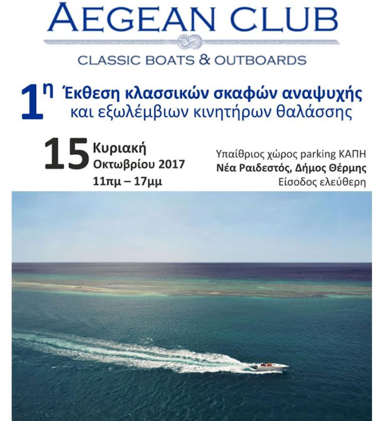 Η πρώτη Ελληνική λέσχη κλασσικών σκαφών και κινητήρων Aegean Club, θα παρουσιάσει στο κοινό για πρώτη φορά κλασσικά σκάφη αναψυχής και κινητήρες της συλλογής της, στην ημερήσια εκδήλωση που διοργανώνει την Κυριακή 15 Οκτωβρίου στον υπαίθριο χώρο parking του ΚΑΠΗ, στη Νέα Ραιδεστό του Δήμου Θέρμης στη Θεσσαλονίκη.