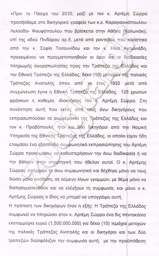 Η συνάντηση πραγματοποιήθηκε πριν από το Πάσχα του 2010 στο δικηγορικό γραφείο των κκ. Καραγιαννόπουλου – Λελούδα – Φουφόπολου επί της οδού Πινδάρου 5, στο Κολωνάκι. Παρόντες ήταν οι δύο νομικοί σύμβουλοι της «Τραπέζης Ελλάδος». Πρόκειται για τους Σοφία Τοσουνίδου και Ηλία Αντωνιάδη. Παρών ο δικαιούχος Αρτέμης Σώρρας και βεβαίως ο βεβαιώσας, ενόρκως, πως η συνάντηση αυτή όντως πραγματοποιήθηκε. Παρόντες επίσης και δύο νομικοί σύμβουλοι της «Εθνικής Τράπεζας», οι οποίοι είχαν ήδη προετοιμάσει εξασέλιδο συμφωνητικό εκπροσώπησης του δικαιούχου Αρτέμη Σώρρα. Άρα, υπήρξε προεργασία και προετοιμασία για την εκπροσώπηση του δικαιούχου.