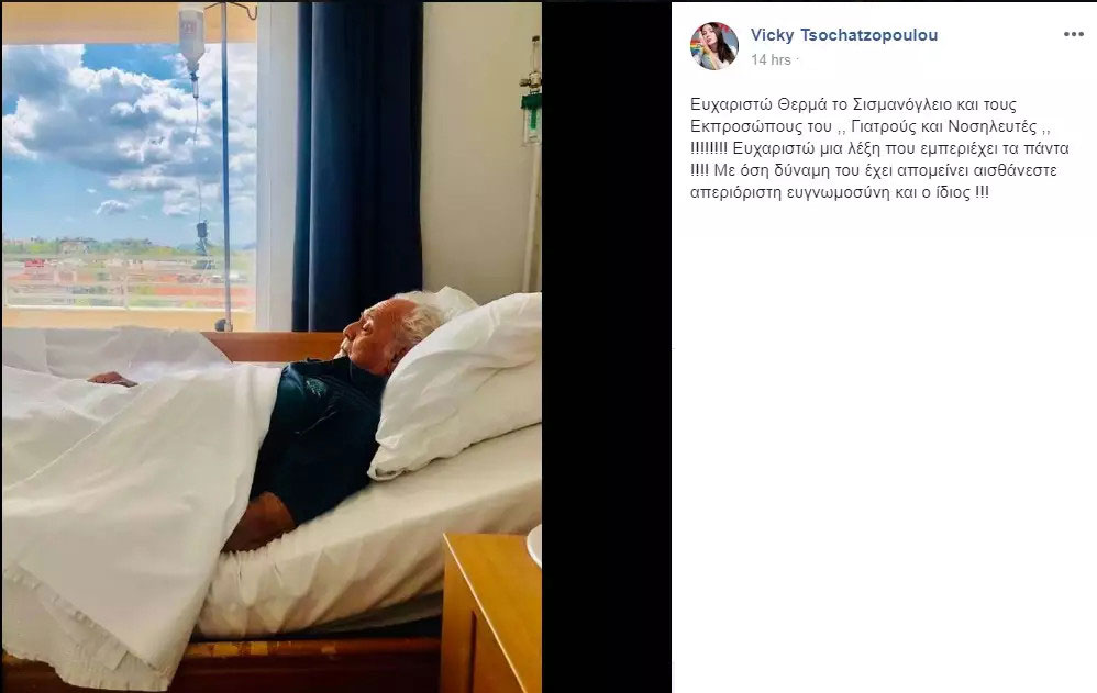 Φωτογραφία με τον Άκη Τσοχατζόπουλο να βρίσκεται στο δωμάτιο του νοσοκομείου που νοσηλευόταν δημοσίευσε στον προσωπικό της λογαριασμό στο Facebook, η σύζυγός του, Βίκυ Σταμάτη, συνοδεύοντας το μήνυμα με τις ευχαριστίες της στους γιατρούς που τον φρόντισαν.