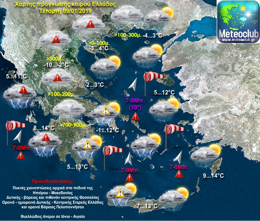 Πυκνές χιονοπτώσεις θα εκδηλώνονται στην Ήπειρο, στη Θεσσαλία και στη δυτική και πιθανώς την κεντρική Μακεδονία αρχικά και σε περιοχές με πολύ χαμηλό υψόμετρο (ενδεικτικά: Ήπειρος >300μ., Θεσσαλία >50-100μ., Μακεδονία >50-100μ.). Το βράδυ όμως τα υψόμετρα όπου θα χιονίζει θα ανέβουν σημαντικά στην Ήπειρο, την κεντρική και νότια Θεσσαλία (>1.100-1.200μ.), ενώ προς αργά το βράδυ θα ανέβουν τα υψόμετρα κατά 200-300μ.