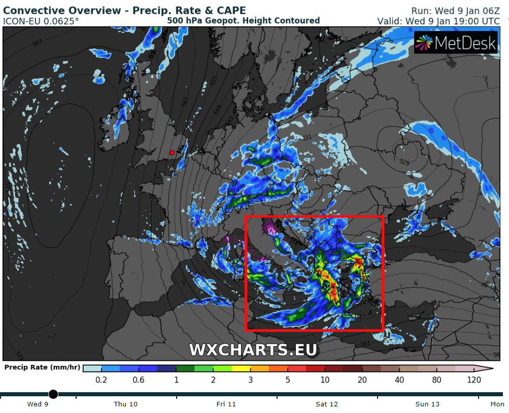 Η «Υπατία», το νέο αυτό βαρομετρικό χαμηλό από τη Σκανδιναβία, κινήθηκε γρήγορα προς τα νότια – νοτιοανατολικά διαγράφοντας μία σχεδόν κάθετη τροχιά και ενισχύθηκε σημαντικά πάνω από την Αδριατική θάλασσα.