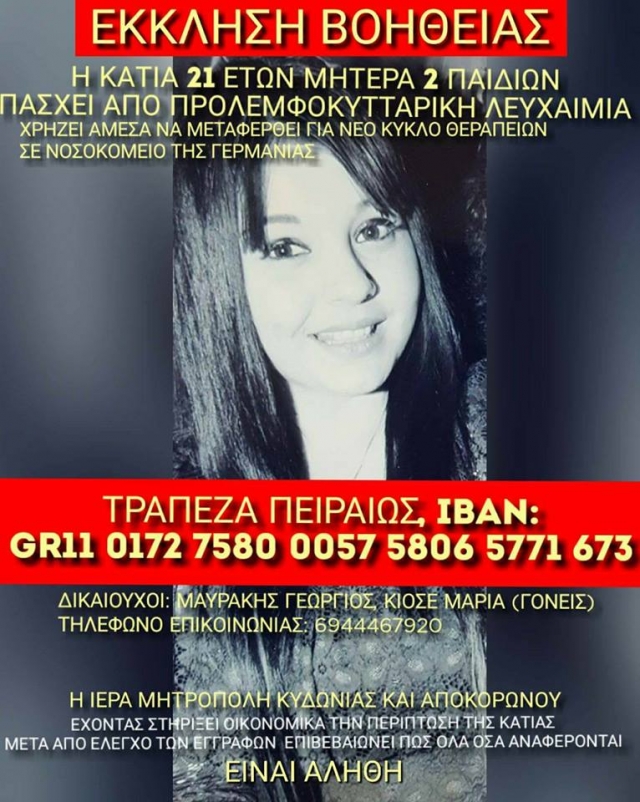 Είναι 21 ετών και μητέρα δύο μικρών παιδιών ωστόσο η ζωή της έπαιξε ένα πολύ άσχημο παιχνίδι. Η Κάτια από τα Χανιά, πάσχει από προλεμφοκυτταρική λευχαιμία και χρειάζεται άμεσα να μεταβεί σε νοσοκομείο της Γερμανίας, λέιπουν όμως 45.000 ευρώ, ποσό το οποίο μπορεί να συγκεντρωθεί αν όλοι βοηθήσουν από το υστέρημά τους.