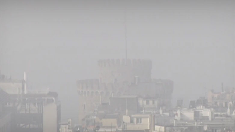 Στα πλάνα που μετέδωσε η ΕΡΤ από το Επταπύργιο η πόλη μετά βίας διακρίνεται καθώς έχει σκεπαστεί από ένα πέπλο αφρικανικής σκόνης, ενώ δεν φαίνεται ούτε η θάλασσα.
