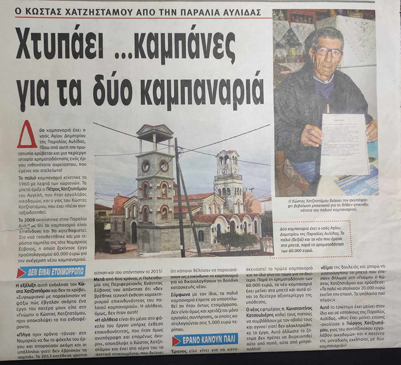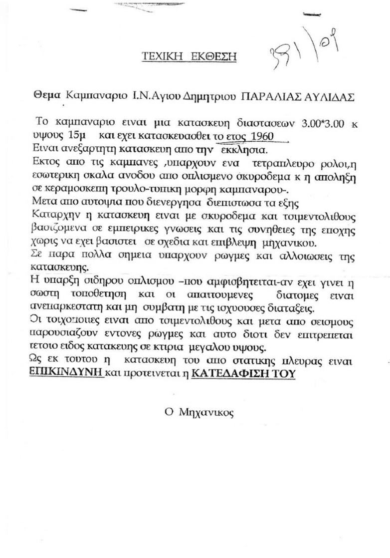 «Θα ήθελα να σας ενημερώσω-καταγγείλω για την αυθαίρετη κατεδάφιση χωρίς καμία έκθεση στατικότητας ή λήψης δείγματος σκυροδέματος, που να πιστοποιεί την επικινδυνότητα και την κατεδάφιση παλαιού καμπαναριού του Ιερού Ναού Αγίου Δημητρίου στην Παραλία Αυλίδος.