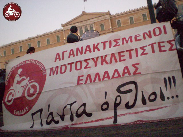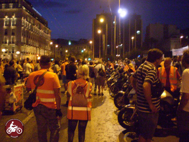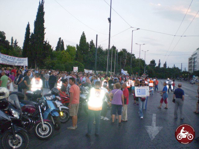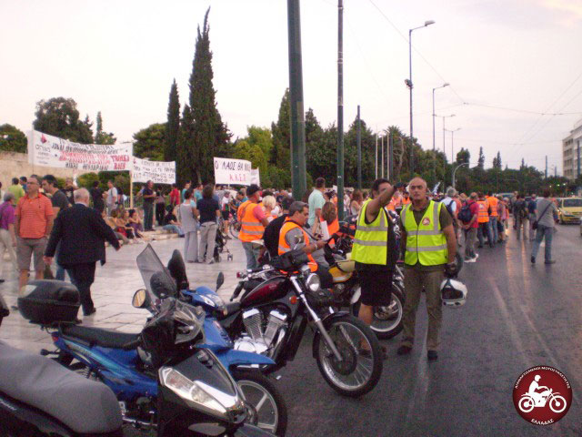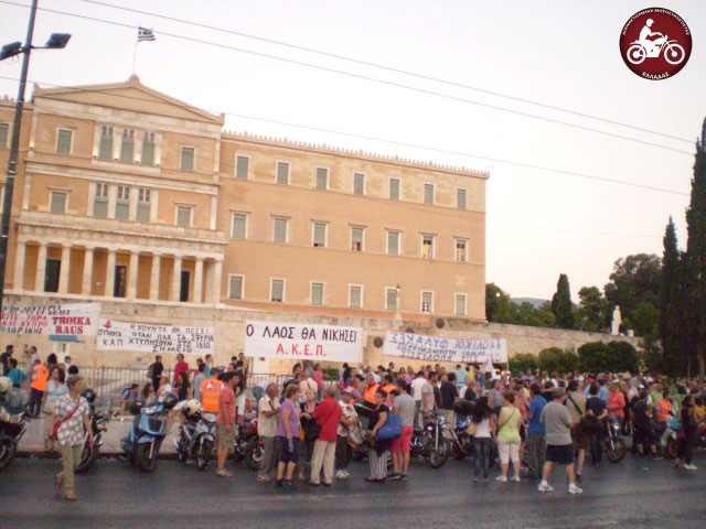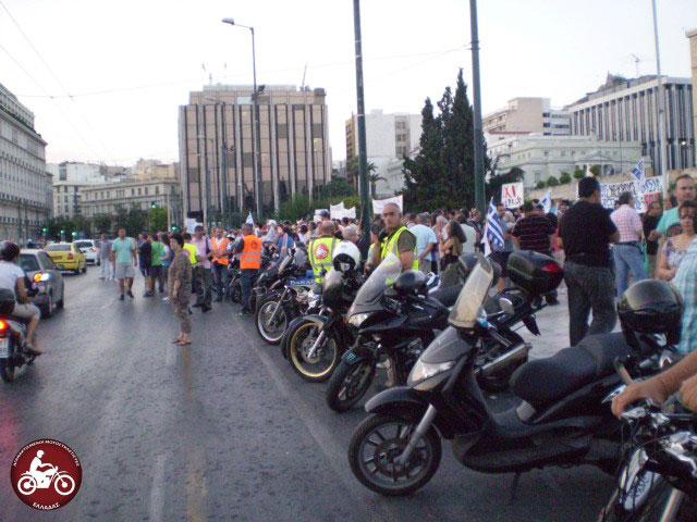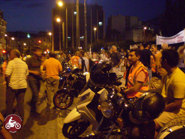 Οι Αγανακτισμένοι Μοτοσυκλετιστές Ελλάδας με 50 μηχανές και περίπου 80 αναβάτες ανταποκρίθηκαν στο από κοινού κάλεσμα της ΑΔΕΔΥ  με τις ΓΣΕΕ και ΠΟΕ-ΟΤΑ για διαμαρτυρία έξω από τη Βουλή μετά τις 19.00 το απόγευμα της Τρίτης.