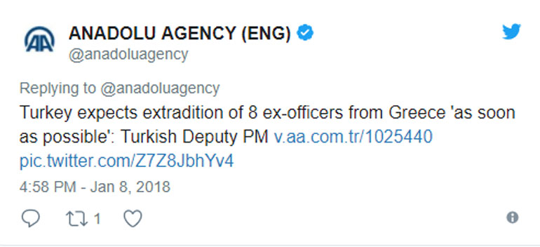Η τοποθέτηση του αξιωματούχου, καθώς ακολούθησε τη συνεδρίαση του υπουργικού συμβουλίου, φαίνεται να αντανακλά κυβερνητική θέση και δείχνει ότι η Άγκυρα δεν προτίθεται να υποχωρήσει από το αίτημά της για έκδοση των οκτώ αξιωματικών, μολονότι ο Άρειος Πάγος έχει απαγορεύσει τελεσίδικα κάθε τέτοιο ενδεχόμενο λόγω φόβων ότι δεν θα λάβουν δίκαιη δίκη για τη φερόμενη συμμετοχή τους στο πραξικόπημα του 2016.