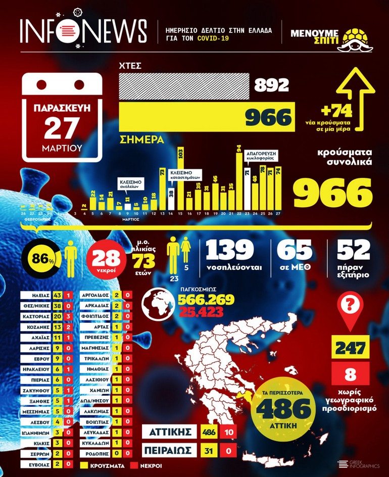 Σε αυτό μεταξύ των άλλων πληροφοριών, βλέπουμε όλα τα κρούσματα και τους νεκρούς ανά γεωγραφική περιοχή της Ελλάδας, ενώ μπορούμε επίσης να κάνουμε εύκολα μια σύγκριση του αριθμού των σημερινών περιστατικών με εκείνα που ανακοινώθηκαν χθες.