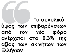 Δεδομένου ότι τα έσοδα που θα βεβαιωθούν εφέτος από τον Ενιαίο Φόρο Ιδιοκτησίας Ακινήτων φθάνουν τα 3,2 δισ. ευρώ, το συνολικό ύψος των επιβαρύνσεων από τον νέο φόρο ανέρχεται στο 0,3% της αξίας των ακινήτων των Ελλήνων.