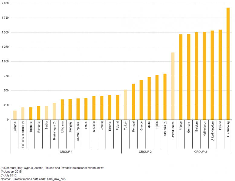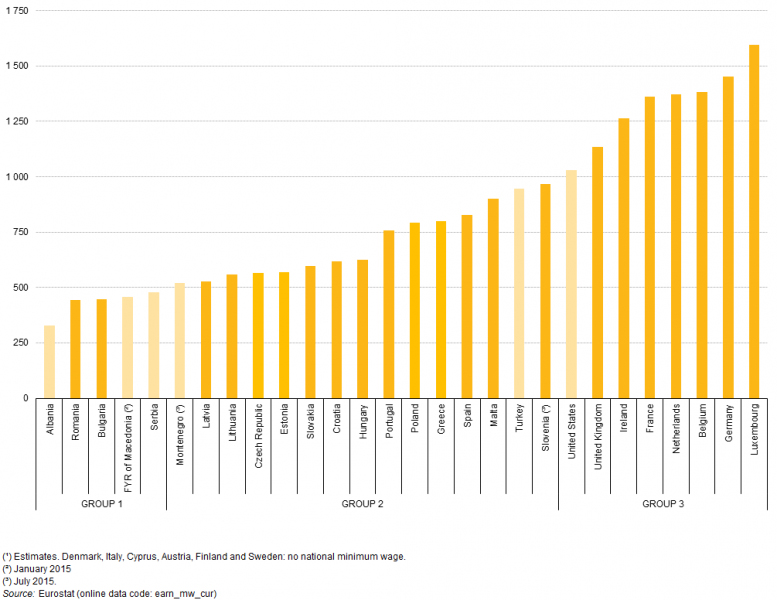 Βάσει των κατώτατων ακαθάριστων μηνιαίων μισθών σε ευρώ (Ιανουάριος 2016) διαμορφώνονται τρεις ομάδες χωρών: