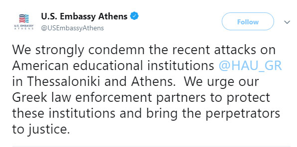 «Καταδικάζουμε έντονα τις πρόσφατες επιθέσεις στα αμερικανικά εκπαιδευτικά ιδρύματα (της Ελληνοαμερικανικής Ένωσης) σε Αθήνα και Θεσσαλονίκη. Προτρέπουμε τις ελληνικές διωκτικές αρχές να προστατέψουν τα ιδρύματα αυτά και να οδηγήσουν ενώπιον της Δικαιοσύνης τους δράστες».