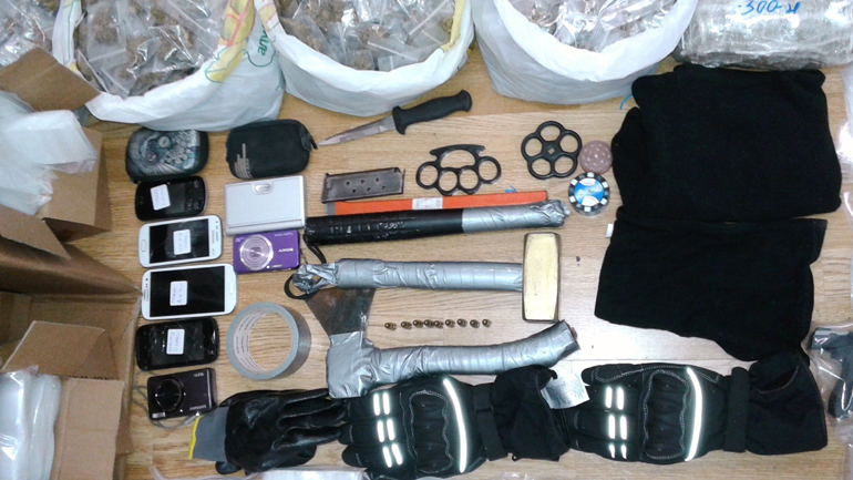 – τσεκούρι, βαριοπούλα και μεταλλικό καλέμι, φακός, πλήθος ιδιοχείρων σημειώσεων στις οποίες αναγράφονταν οι ποσότητες ναρκωτικών που έχουν πωληθεί, οι ποσότητες που υπάρχουν στο απόθεμα προς πώληση και χρηματικά ποσά.