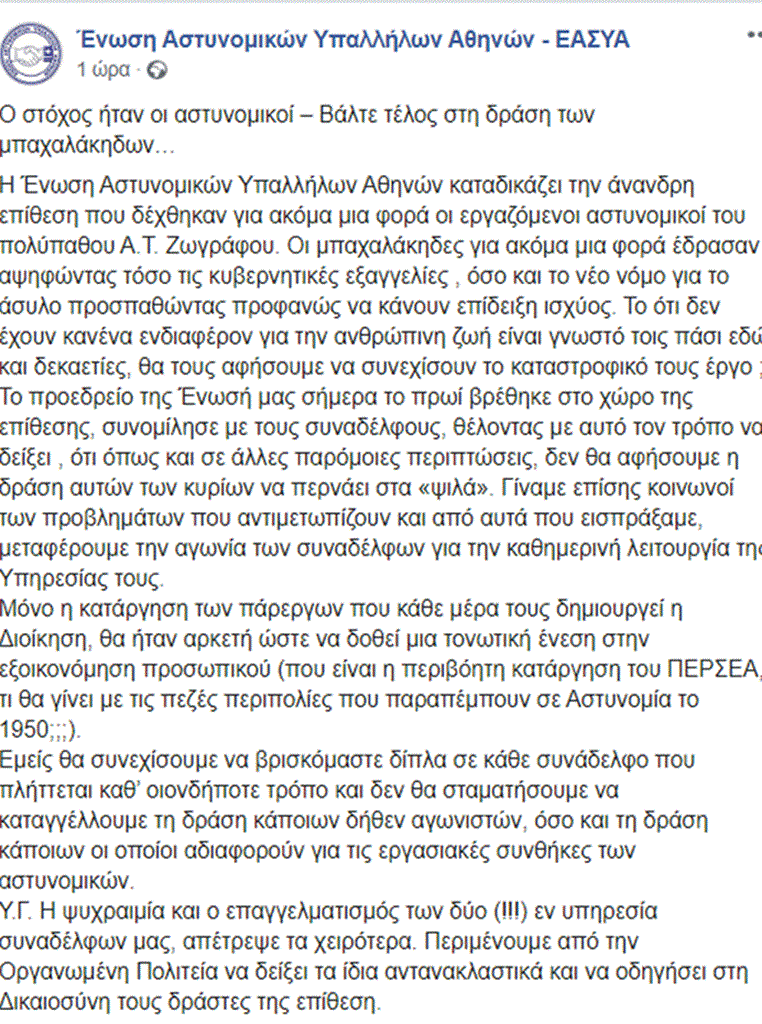 Παράλληλα, επισημαίνεται ότι η ψυχραιμία και ο επαγγελματισμός των δύο αστυνομικών που ήταν σε υπηρεσία απέτρεψε τα χειρότερα. «Περιμένουμε από την οργανωμένη πολιτεία να δείξει τα ίδια αντανακλαστικά και να οδηγήσει στη Δικαιοσύνη τους δράστες της επίθεσης», καταλήγει η ανακοίνωση της ΕΑΣΥΑ.
