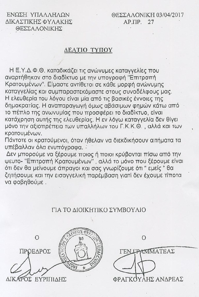 Έντονες αντιδράσεις έχει προκαλέσει η δημοσίευση στο zougla.gr των καταγγελιών από την Επιτροπή Κρατουμένων που εκτίουν την ποινή τους στο Κατάστημα Κράτησης Διαβατών Θεσσαλονίκης. Μετά από την ανακοίνωση της Ομοσπονδίας Σωφρονιστικών Υπαλλήλων Ελλάδος (διαβάστε τη εδώ) , το βράδυ της Δευτέρας εξέδωσε ανακοίνωση και η Ένωση Υπαλλήλων Δικαστικής Φυλακής Θεσσαλονίκης.