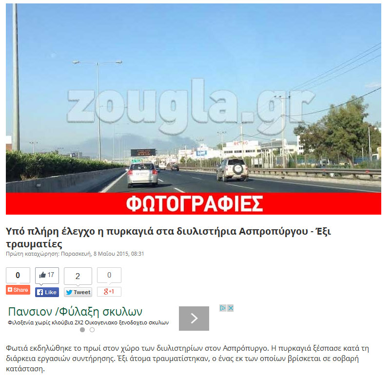 »Σήμερα, ώρα 08:20, υπήρξε περιστατικό ανάφλεξης σε μονάδα των εγκαταστάσεων του διυλιστηρίου Ασπροπύργου, κατά τη διάρκεια προγραμματισμένων εργασιών συντήρησης από έμπειρη ελληνική εργολαβική εταιρεία. Διεκομίσθησαν σε νοσοκομεία της περιοχής έξι τραυματίες.