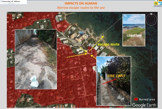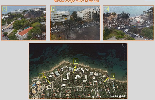 Στην έρευνα επίσης επισημαίνεται η διαπίστωση για τις ανύπαρκτες διόδους εξόδου προς τη θάλασσα, με αποτέλεσμα οι πολίτες να εγκλωβιστούν και να βρουν φρικτό θάνατο. Διαπίστωση που αποτυπώνεται και στα 35 εγκαταλειμμένα σε συμφόρηση και σε πολύ μικρό χώρο, καμένα αυτοκίνητα.