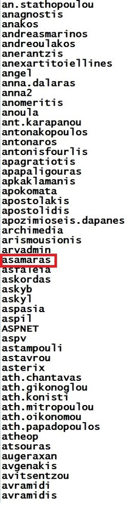 Αξιοποιώντας τα στοιχεία αυτά φαίνεται ότι απέκτησαν επιπλέον πρόσβαση σε μεγάλο αριθμό υπολογιστών στελεχών της Βουλής, εργαζομένων, υπουργών, βουλευτών κ.ά.. Αυτό αποδεικνύεται από το γεγονός ότι διαθέτουν ΠΛΗΡΗ λίστα όλων των usernames που χρησιμοποιούνται για την πρόσβαση στους υπολογιστές της Βουλής, ακόμα και του ίδιου του πρωθυπουργού Α. Σαμαρά αλλά και του κ. Ευάγγελου Βενιζέλου. Δείτε τα σχετικά Screenshots όπως απεστάλησαν: