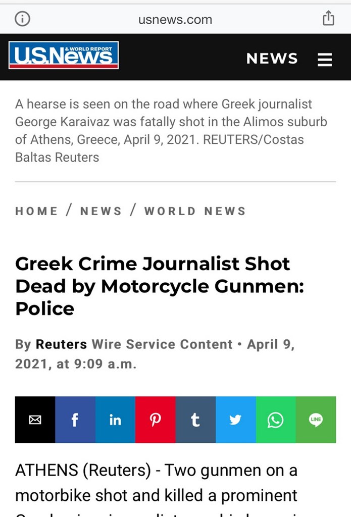 Το US News εξίσου κάνει λόγο για δολοφονία Έλληνα δημοσιογράφου του αστυνομικού ρεπορτάζ από ένοπλους μοτοσικλετιστές, αναδημοσιεύοντας ουσιαστικά το τηλεγράφημα του πρακτορείου Reuters.