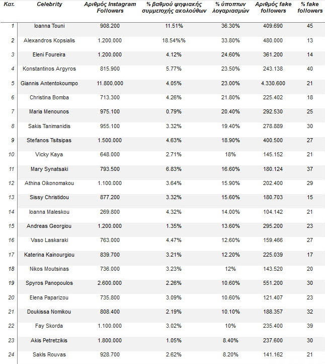 Παραθέτουμε έναν πίνακα που δημοσίευσε εξειδικευμένη βρετανική ιστοσελίδα η οποία αποκαλύπτει το μέγεθος της απάτης με πολύ γνωστά ονόματα όσον αφορά τον αριθμό των ακολούθων τους.