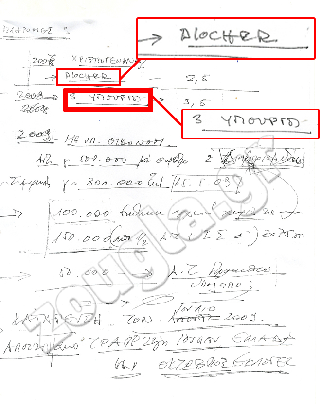 Συγκεκριμένα από το έγγραφο αυτό προκύπτει ότι ο πρώην υπουργός φαίνεται πως είχε σκοπό να δώσει το ποσό των 2,5 εκατ. (ευρώ ή δολαρίων), στον πρώην ισχυρό άνδρα της Ζυρίχης τα Χριστούγεννα του 2007 και 3,5 εκατ. (ευρώ ή δολάρια) σε τρεις Έλληνες υπουργούς το 2008.